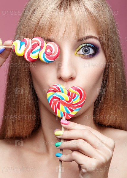 Портрет красоты молодой блондинки на розовом фоне. Женщина с леденцом на палочке в руках