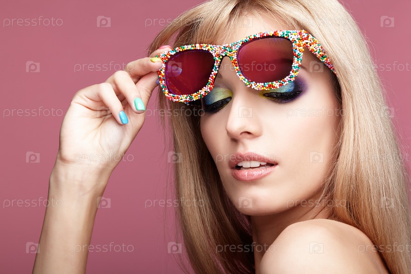 Молодая блондинка в веселых конфетных очках на розовом фоне смотрит вниз