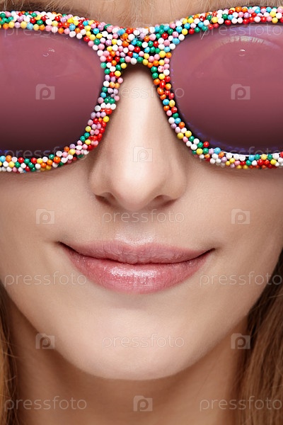 Крупный план портрета молодой блондинки, улыбающейся женщины в веселых конфетных очках
