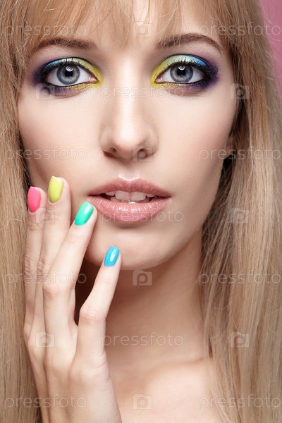 Крупным планом изображение человеческого женского глаза с фиолетовыми тенями, синим и желтым макияжем