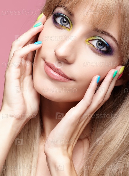 Крупным планом изображение человеческого женского глаза с фиолетовыми тенями, синим и желтым макияжем