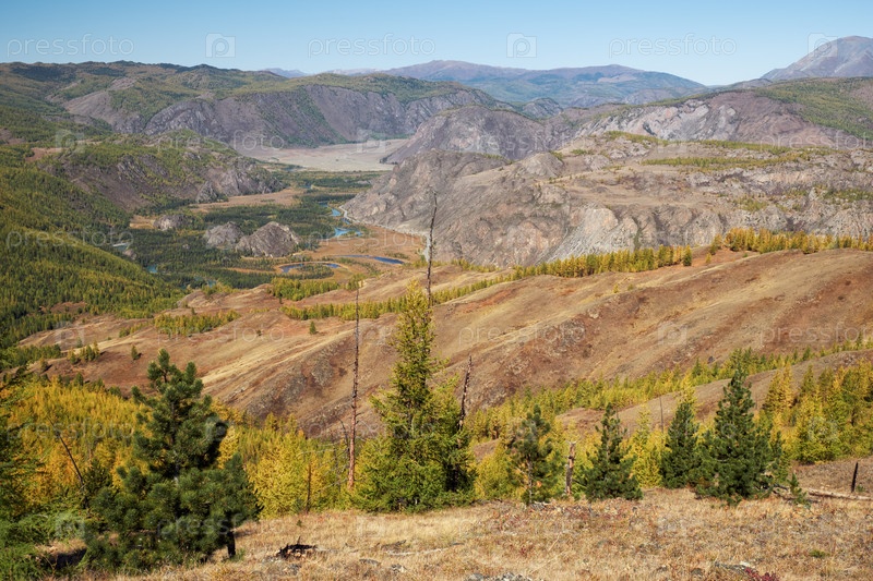 Осенний высокогорный пейзаж. Алтайская река Чуя окружена горами. Алтай, Россия