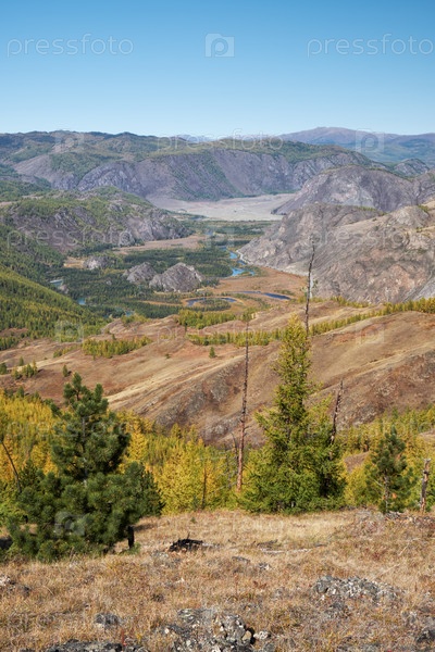 Осенний высокогорный пейзаж. Алтайская река Чуя окружена горами. Алтай, Россия