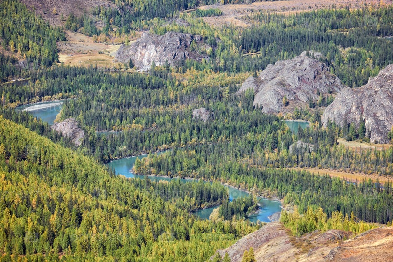 Осенний высокогорный пейзаж. Алтайская река Чуя окружена горами. Алтай, Россия