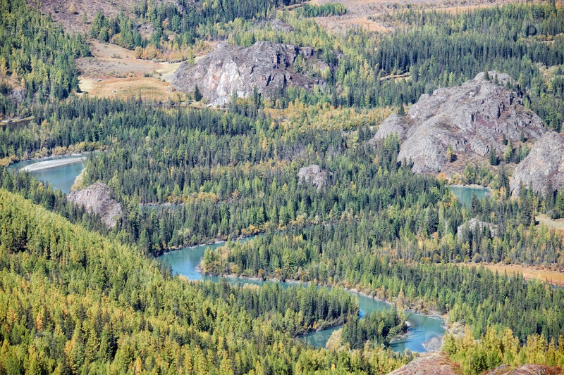 Осенний высокогорный пейзаж. Алтайская река Чуя окружена горами. Алтай, Россия