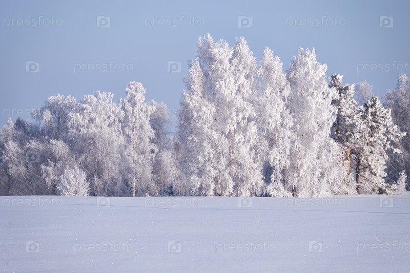 Березы под инеем на снежном поле в зимний сезон
