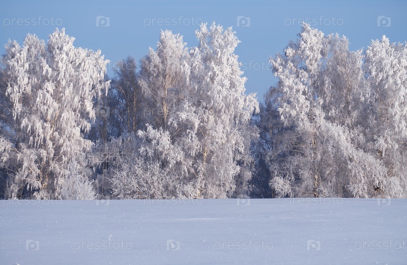 Березы под инеем на снежном поле в зимний сезон