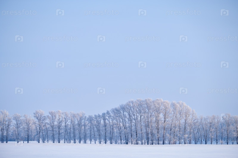 Лесополоса тополей под инеем на снежном поле в зимний сезон