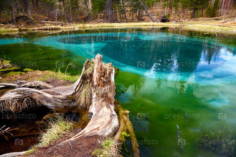 Так называемое голубое гейзерное озеро в горах Алтая