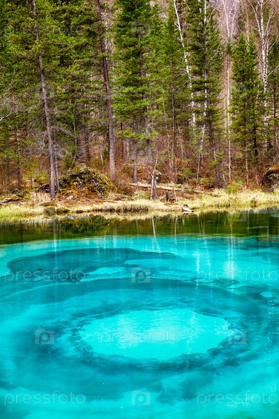 Так называемое голубое гейзерное озеро в горах Алтая