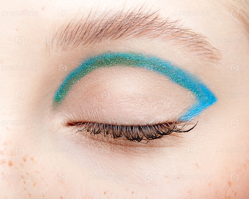 Макрофотография крупным планом закрытых человеческих женских глаз и с голубыми дымчатыми тенями