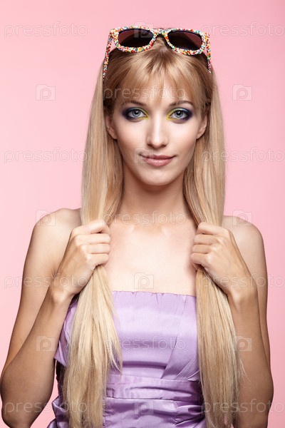 Молодая блондинка в веселых конфетных очках на розовом фоне