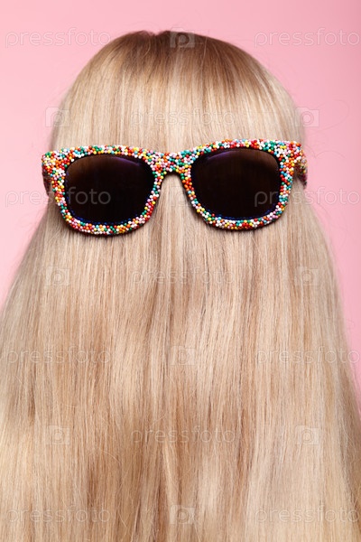 Вид сзади на молодую женщину. Светлые прямые волосы в забавных солнцезащитных очках