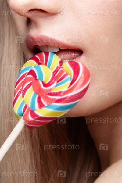 Портрет красоты молодой блондинки. Женщина с леденцом на палочке в руках
