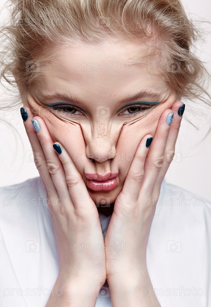 Эмоциональный портрет молодой блондинки сжимает кожу лица на щеках