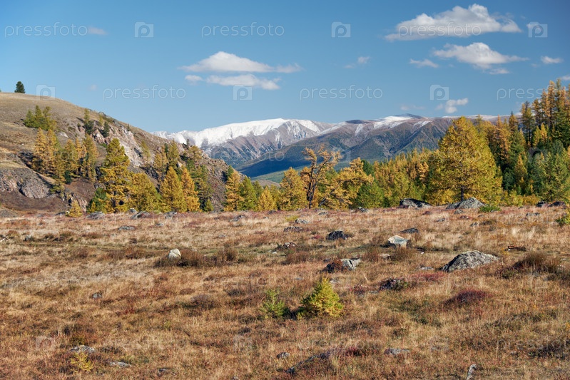 Северо-Чуйский хребет с камнями на переднем плане и лиственничным лесом и снежными горами на заднем плане