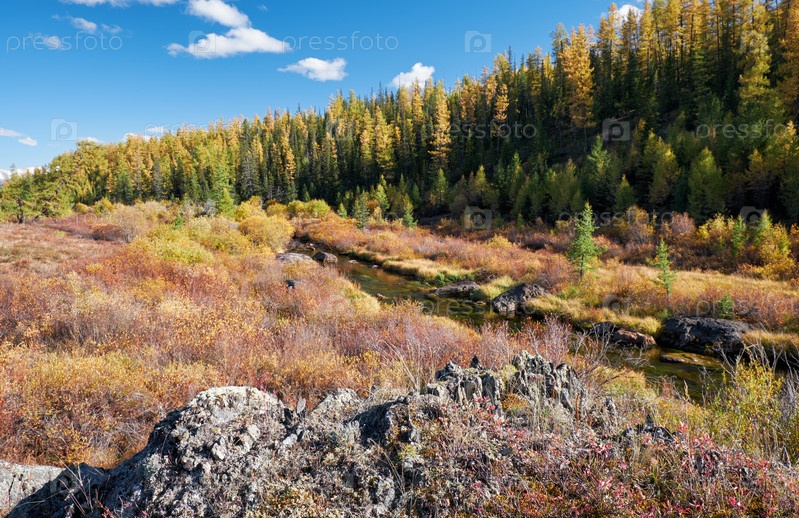 Алтайская река Куркурек с лиственничным лесом на плато Эштыкель
