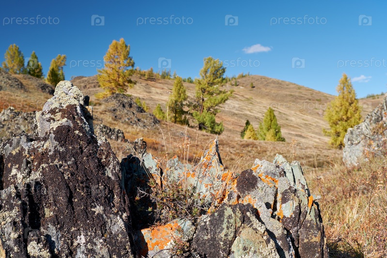 Алтайский осенний пейзаж с камнями на переднем плане и холмами с лиственницами на заднем плане