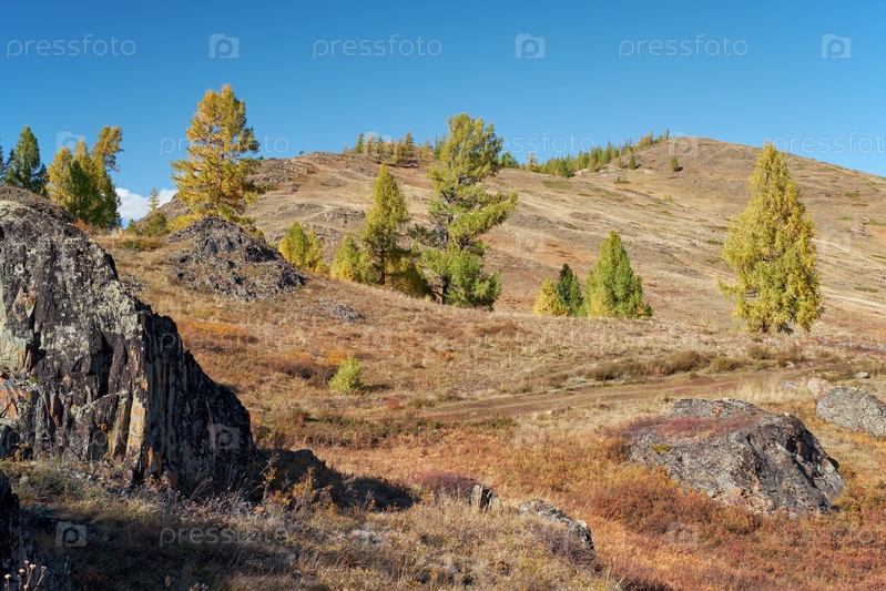 Алтайский осенний пейзаж с камнями на переднем плане и холмами с лиственницами на заднем плане