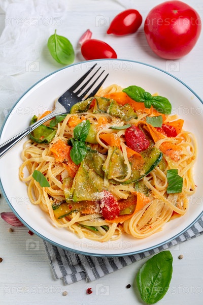 Паста лингвини с овощами в томатном соусе