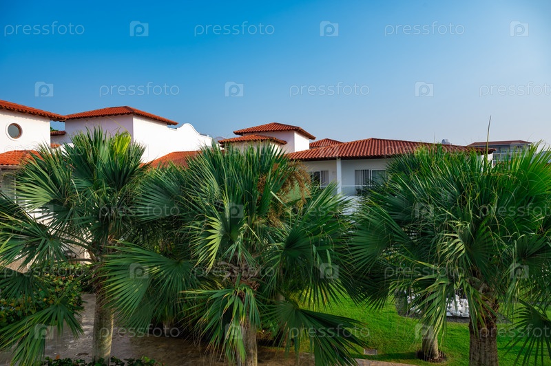 Отель с красной черепицей в зеленых листьях