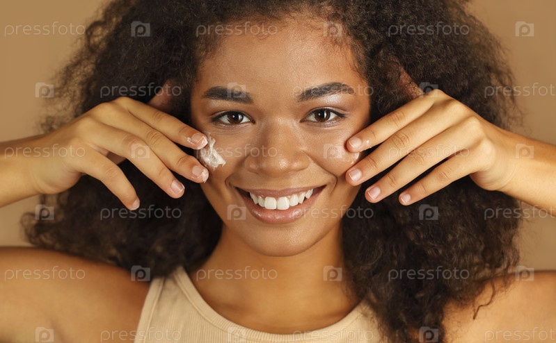 Крупный план улыбающейся темнокожей женщины с вьющимися афро-волосами, наносящей крем для лица