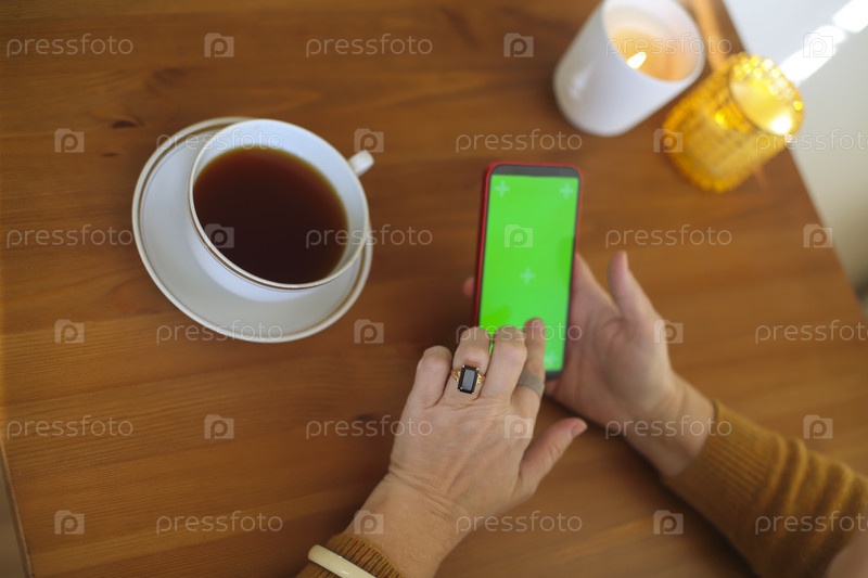 Женщина держит смартфон с зеленым экраном, сидит за столом с чашкой чая и пользуется мобильным телефоном