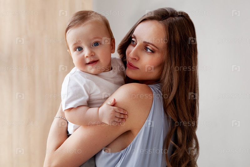 Счастливое детство. Привлекательная мать любит своего очаровательного сына и маленького ребенка, смотрящего в камеру своими голубыми глазами