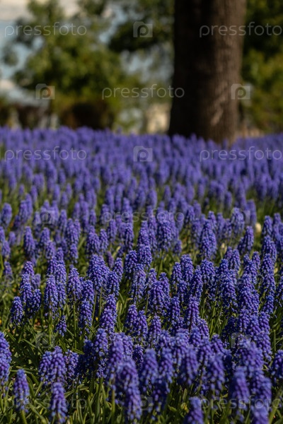 Весенние синие цветы Мускари солнечным днем в городском парке