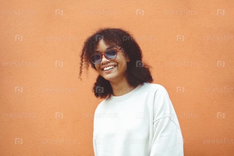 Молодая женщина африканского происхождения в стильных солнцезащитных очках, с вьющимися волосами