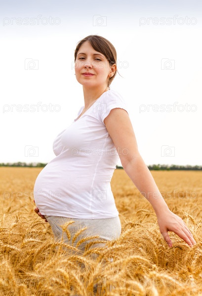 Беременная женщина стоит на ржаном поле