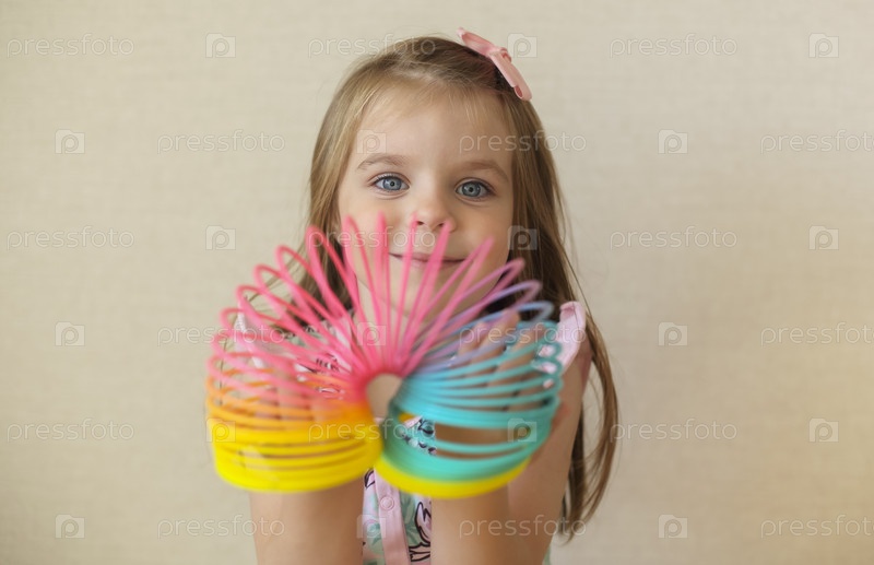 Милая очаровательная маленькая девочка держит пластиковую радужную волшебную весеннюю игрушку, изолированную на бежевом фоне