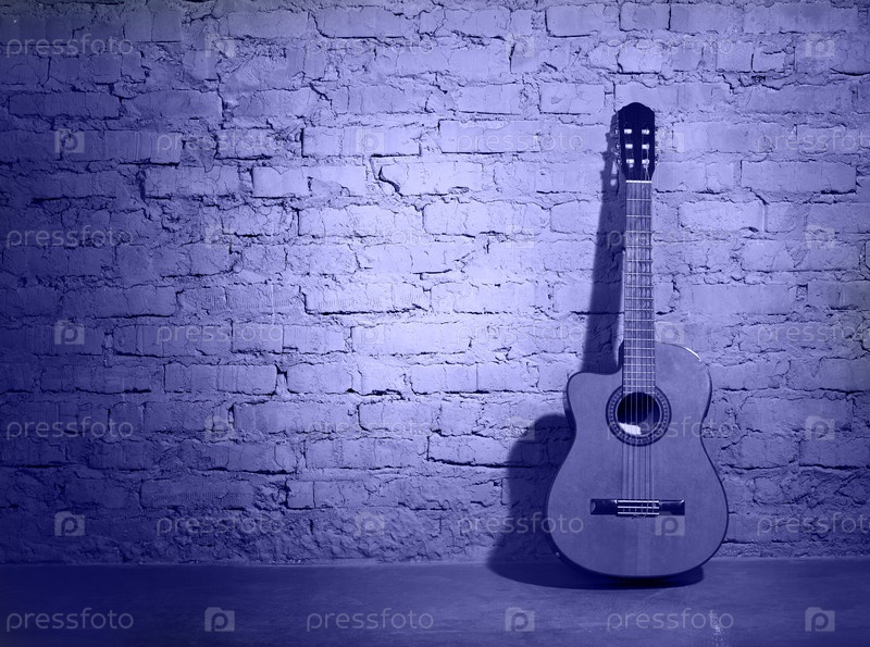 Акустическая гитара, опирающаяся на безобразную стену