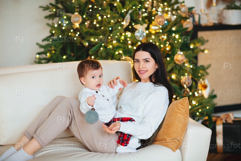 Мать играет с сыном возле елки