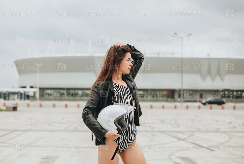 Вид сбоку на стройную брюнетку-байкершу в боди и кожаной куртке с защитным велосипедным шлемом