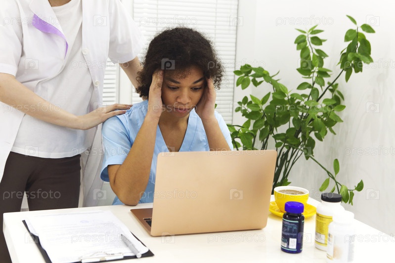 Плачущая расстроенная медсестра смешанной расы или афроамериканский врач из-за проблем со стрессом на работе