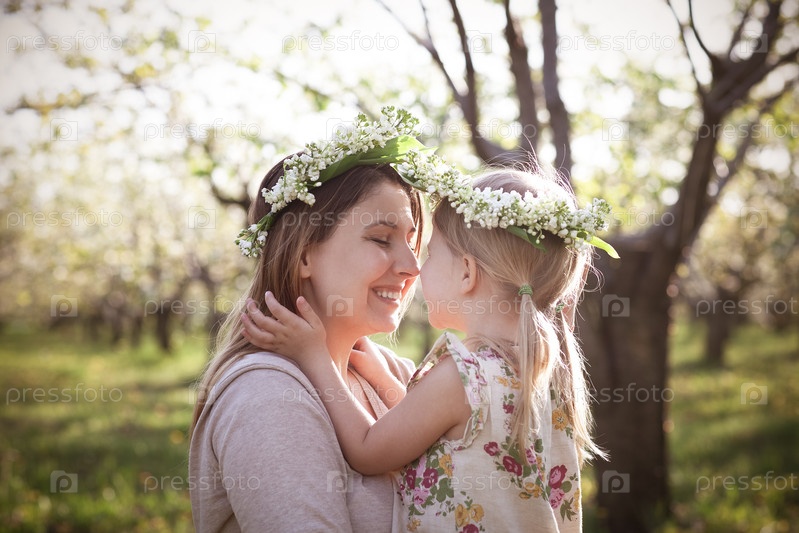 Счастливая мать и ее маленькая дочь в весенний день в цветущем саду