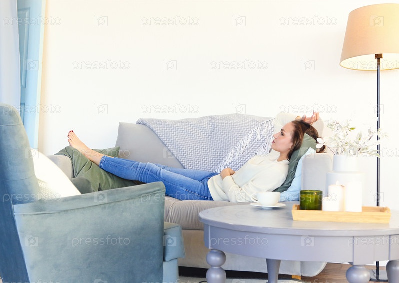Молодая брюнетка расслабляется на диване после долгого дня. Концепция уютного дома
