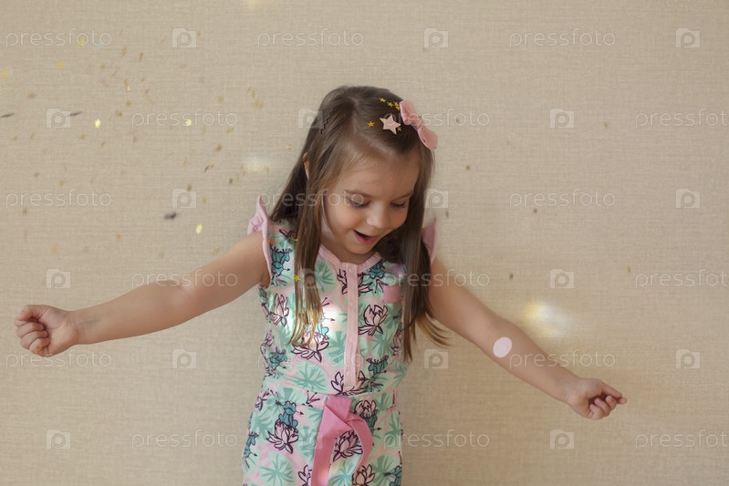 Возбужденная милая маленькая девочка бросает в воздух золотые блестящие конфетти и смеется над бежевой стеной