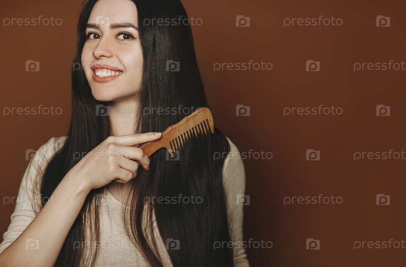 Молодая счастливая брюнетка расчесывает свои длинные здоровые каштановые волосы и улыбается в камеру. Уход за волосами