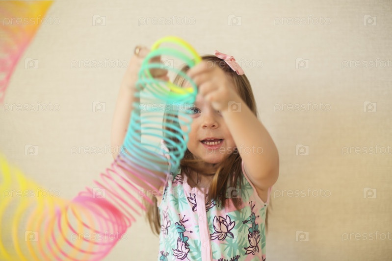 Милая очаровательная маленькая девочка, играющая с пластиковой радужной волшебной пружиной, держа упругую эластичную игрушку и улыбаясь в камеру
