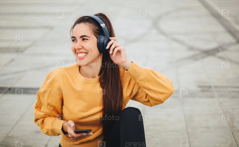 Уличное фото счастливой молодой женщины в наушниках, слушающей музыку на смартфоне