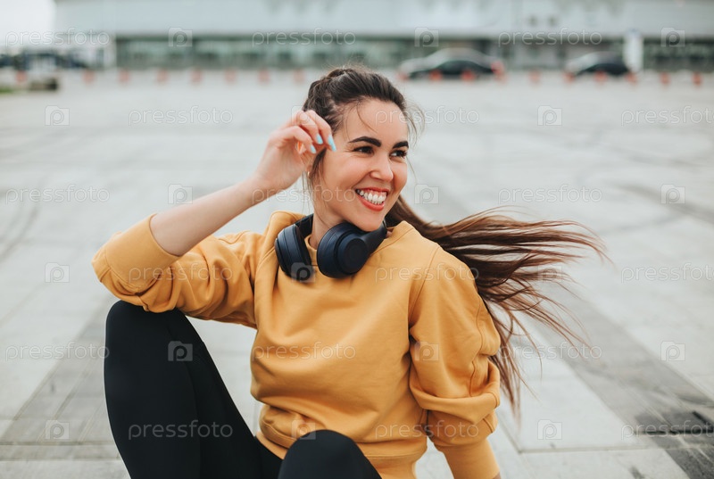 Уличное фото счастливой молодой женщины в наушниках, слушающей музыку на смартфоне