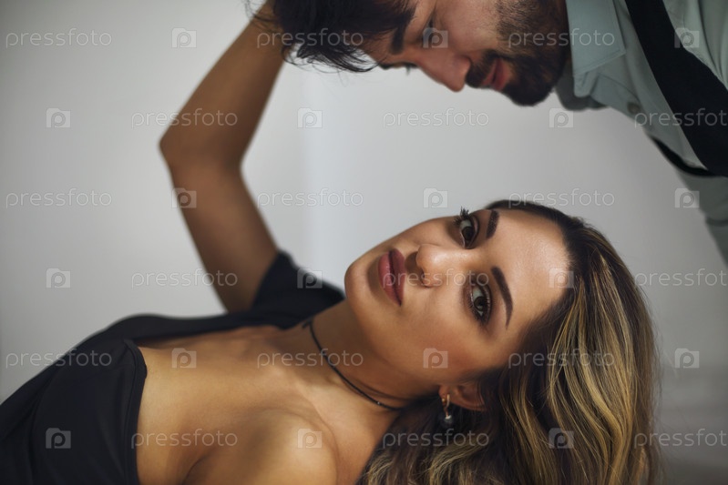 Стильная молодая этническая пара обнимается у светло-серой стены