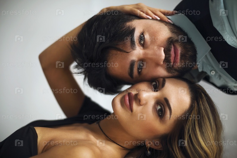 Стильная молодая этническая пара обнимается у светло-серой стены