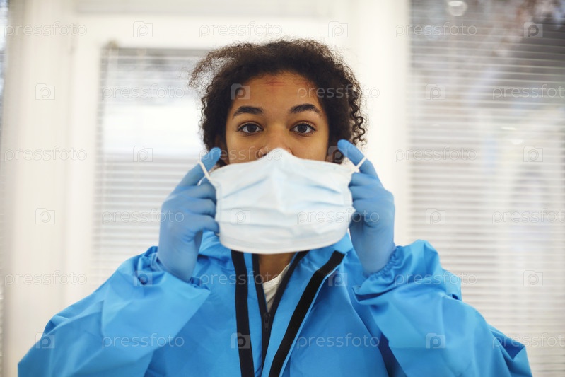 Портрет молодого уставшего афроамериканского медицинского работника или медсестры в защитном снаряжении, снимающего маску