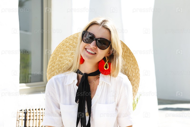 Веселая женщина в белых одеждах на террасе курорта