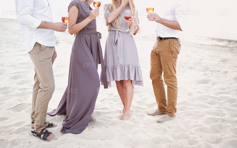 Счастливые друзья вместе празднуют особое событие на пляже в выходные