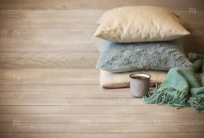 Удобные подушки и белая кружка горячего напитка в уютной гостиной