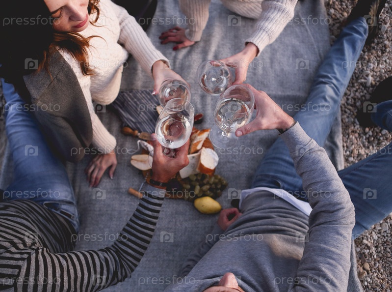 Счастливые друзья вместе празднуют особое событие на пляже в выходные